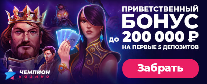 Получить приветственные бонусы просто. Зарегистрируйтесь на сайте казино Чемпион, в кассе выберите бонус 100% на депозит и пополните счет от 1 000 рублей, чтобы активировать его.